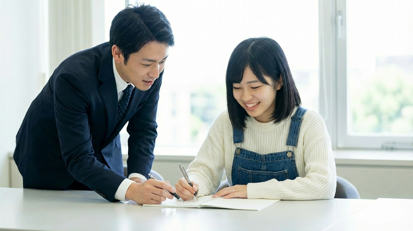 ライティング丁寧添削で得点UP。本番形式の面接対策・入室〜退室のマナーまで徹底指導。