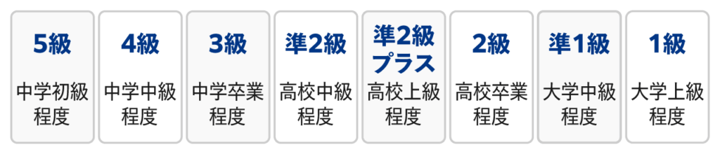 5級(中学1年レベル)から1級(大学上級レベル)まで段階的に難易度が上がる構造で、適切な級を選択すれば初心者でも合格という形で達成感を得られます。