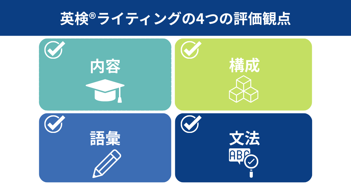 評価基準は内容、構成、語彙、文法の4項目で各4点、計16点満点です。